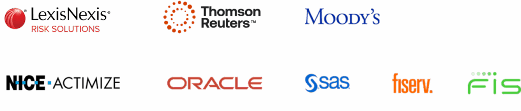 • Integrates with LexisNexis, Thomson Reuters, Moody’s and other sources for enriching data, as well as NICE Actimize, Verafin, SAS, Oracle SCM, Fiserv, FIS and other Transaction Monitoring software
